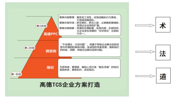 “TCS” TCS(T-training培训,C- consulting微咨询,S-solution解决方案)。TCS方案构成:培训、微咨询、高德PPC云管理平台落地,运用移动互联网技术,大数据技术与先进的管理思想、管理咨询相结合,帮助企业提升管理效率与组织能力,这将是对中小企业一次颠覆性的革命。